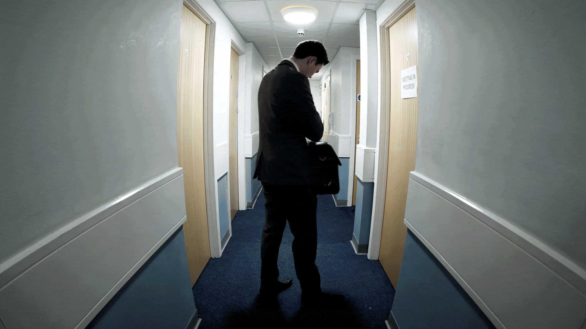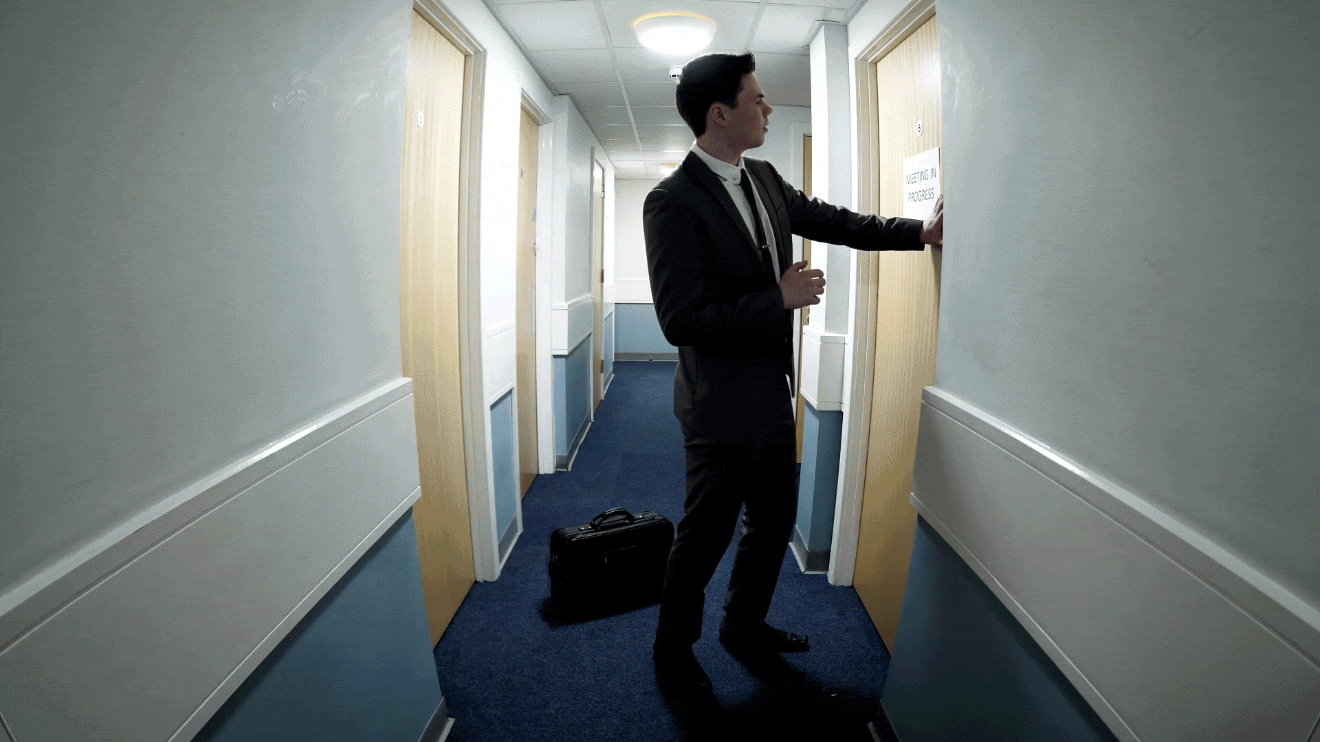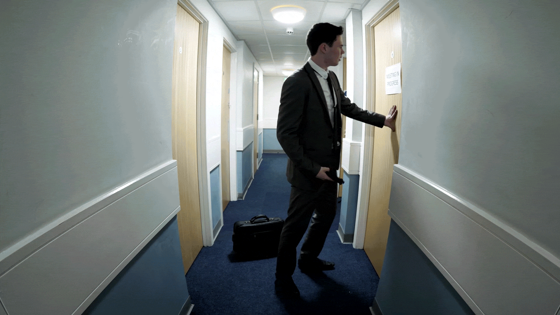 Dave, a young ambitious businessman who is late for an important meeting, repeatedly finds himself back in the same corridor, no matter which door he exits.